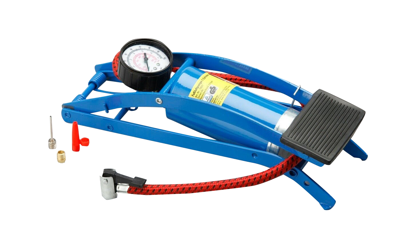 Die Hochleistungs-Fußluftpumpe mit einem Zylinder von Inter-Union dient zum Beispiel der Befüllung von Autoreifen, Fahrradreifen und Luftmatratzen.