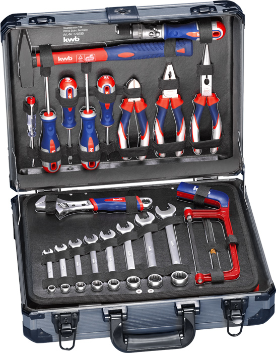 1 Bit Adapter 30 mm CRV 1 quick release CRV, head red color 1 Aluminium Wasserwaage 300 mm 1 Metallsägebogen 150mm + 3Ersatzsägeblätter 1 Adapter 25 mm CRV 4 Doppelend-Bits in Plastik-Box ...1 Bit PH no. 0 X Flat 3,0 ...1 Bit PH no. 00 X Flat 2,0 ...1 Bit PH no. 1 X Flat 4,0 ...1 Bithalter Handgriff 110 mm 1 Schlosserhammer 300g GS m. fiber glass Stiel 1 Rollbandmaß 5mX16mm + MID CLASS 2 "1 Umschaltknarre 1/2"" CRV 2" 1 Umschaltknarre 1/4 CRV 2 "2 Zündkerzeneinsatz 1/2""x16 + 21 mm CRV" "11 Steckschlüssel-Einsätze 6-k, 1/2"" 10, 13, 14," . 16, 17, 18, 19, 20, 22, 24, 27 mm CRV "12 Steckschlüssel-Einsätze 6-k, 1/4"" 4, 4.5, 5, " . 5.5, 6, 7,8, 9, 10, 11, 12, 13 mm CRV "1 Universalgelenk 1/2"" CRV" "2 Universalgelenk 1/4"" CRV" "1 T-Gleitgriff 1/4""x4 1/2"" (114 mm) CRV" "1 Verlängerung 1/4""x2"" (50 mm) CRV" "1 Verlängerung 1/4""x4"" (100 mm) CRV" "2 Verlängerung 1/2""x5"" (125 mm) CRV" "3 Verlängerung 1/2""x10"" (250 mm) CRV" 1 3-Wege-Adapter CRV, 1 Seegeringzangensatz 150 mm 4-tlg 1 Spannungsprüfer CE/GS geprüft, Kangda 1 Kabelschuhzange 225 mm 1 Schraubendreher flach 5x75 CRV Kp-Griff 1 Schraubendreher flach 6x100 CRV Kp-Griff 1 Schraubendreher PH Nr. 1x75 CRV Kp-Griff 1 Schraubendreher PH Nr. 2x100 CRV Kp-Griff 9 Sechkant-Stiftschlüssel mit Halter . 1,5,2,2.5,3,4,5,6,8,10 mm CRV-DIN 1 Seitenschneider 160mm 3-KP-Griff 1 Kombizange 180mm, 3-Kp-Griff, 1Telefonzange 200 mm, 3-Kp-Griff 1 Wasserpumpenzange 240mm, 3-Kp-Griff 8 Gabel-Ringschlüssel 8, 10, 11, 12, 13, . 15, 17, 19 mm, CRV DIN 3113A 1 Trapezklingenmesser 2-Kp-Gehäuse 16 Kabelverbinder sortiert "1 Handschraubendreher m. Ratsche 1/4""" "1 Rollgabelchlüssel 8"" (200 mm) 2-Kp-Griff" 31 Bits in Box, S2: Bits gestempelt mit kwb . 4 Stück Pozidriv: PZ1, PZ2, PZ2, PZ3 . 4 Stück Phillips: PH1, PH2, PH2, PH3, . 4 Stück 6-kant (Hex): 3, 4, 5, 6 . 1 Stück Bithalter 60 mm . 7 Stück Torx: T10, T15, T20, T25, T27, T30, T40 . 4 Stück Flach: 3, 4, 5, 6 mm . 7 St. T-Torx: T10, T15,