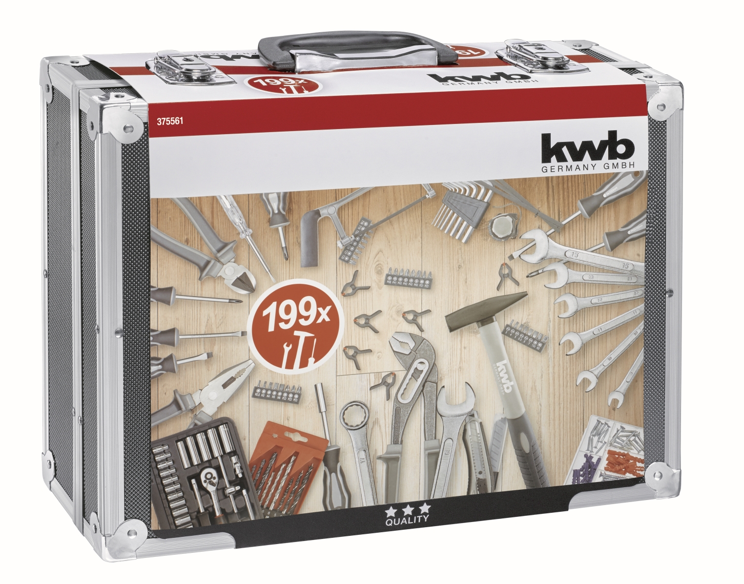 199-teiliger kwb Werkzeugkoffer, der ein breites Sortiment an Werkzeugen bietet. Bestens geeignet als Grundausstattung für eine Werkstatt oder dank des stabilen Alu-Koffers ideal für unterwegs.